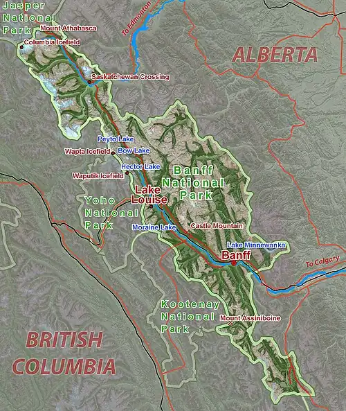 Banff National Park is in the Rocky Mountains on Alberta's western border with British Columbia in the Alberta Mountain forests ecoregion. By road, the town of Banff is 128 kilometres (80 mi) west of Calgary and 401 km (249 mi) southwest of Edmonton.[30] Jasper National Park borders Banff National Park to the north, while Yoho National Park is to the west and Kootenay National Park is to the south.[31] Kananaskis Country, which includes Bow Valley Wildland Provincial Park, Spray Valley Provincial Park, and Peter Lougheed Provincial Park, is located to the south and east of Banff. The Trans-Canada Highway passes through Banff National Park, from the eastern boundary near Canmore, through the towns of Banff and Lake Louise, and into Yoho National Park in British Columbia.[30] The Banff townsite is the main commercial centre in the national park. The village of Lake Louise is at the junction of the Trans-Canada Highway and the Icefields Parkway, which extends north to the Jasper townsite.[30]