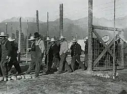 During World War I, immigrants from Austria-Hungary and Germany were sent to Banff to work in internment camps.[18] The main camp was at Castle Mountain, and was moved to Cave and Basin during winter.[18] Much early infrastructure and road construction was done by men of various Slavic origins although Ukrainians constituted a majority of those held in Banff.[19] Historical plaques and a statue erected by the Ukrainian Canadian Civil Liberties Association commemorate those interned at Castle Mountain, and at Cave and Basin National Historic Site where an interpretive pavilion dealing with Canada's first national internment operations opened in September 2013.[20]