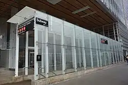 Immediately outside the Bank of America Tower is an entrance to the New York City Subway's 42nd Street–Bryant Park/Fifth Avenue station,[4][16] which is served by the 7, <7>, B, D, F, <F>, and M trains.[17] The entrance is designed to harmonize with the lobby adjacent to it.[18] The subway entrance consists of a glass enclosure with a pair of staircases, which lead north and south from Sixth Avenue to the station's underground mezzanine.[4] The subway entrance has an elevator as well.[16] On the subway entrance's glass roof is a BIPV installation, which produces some electricity for the structure.[19]