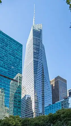 ![]() The Bank of America Tower (the building with the spire) from Bryant Park in January 2015, partially concealed behind 1095 Avenue of the Americas | |