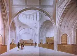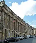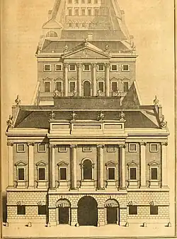 The newly built premises, designed by George Sampson, occupied a narrow plot (around 80 feet (24 m) wide) extending north from Threadneedle Street.[55] The front building contained transfer offices on the first floor, beneath which was an entrance arch leading to a courtyard. Facing the entrance was the 'main building' of the bank:[56] a large Hall (79 ft × 40 ft (24 m × 12 m)) in which bank notes were issued and exchanged,[57] and where deposits and withdrawals could be made.[43] (Sampson's Great Hall, later known as the Pay Hall, remained in situ and in use until Herbert Baker's comprehensive rebuilding in the late 1920s.)[58] Beyond the Hall was a quadrangle of buildings enclosing a 'spacious and commodious Court-yard' (later known as Bullion Court). On the south side of the quadrangle were the Court Room and Committee Room, on the north side was a large Accountants' Office; on either side were arcaded walkways, with rooms for the senior officers, while the upper floors contained offices and apartments.[55] Beneath the quadrangle were the vaults ('that have very strong Walls and Iron Gates, for the Preservation of the Cash'); access to the courtyard was provided, by way of a passage leading to a 'grand Gateway' on Bartholomew Lane, for the coaches and waggons 'that come frequently loaded with Gold and Silver Bullion'.[56] The pediment above the entrance to the main Hall was decorated with a carved alto relievo figure of Britannia (who had appeared on the common seal of the bank since 30 July 1694);[59] the sculptor was Robert Taylor, who went on to be appointed Architect, in succession to Sampson, in 1764. Inside, the east end of the Hall was dominated by a large statue by John Cheere of King William III,[60] lauded in an accompanying Latin inscription as the bank's founder (conditor);[50] at the opposite end, a large Venetian window looked out on St Christopher's churchyard.