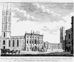 The Bank of England moved to its current location, on the site of Sir John Houblon's house and garden in Threadneedle Street (close by the church of St Christopher le Stocks), in 1734.[54] (The estate had been purchased ten years earlier; Houblon had died in 1712, but his widow lived on in the house until her death in 1731, after which the house was demolished and work on the bank began.)[49]