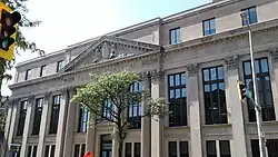 In 1960, the Bank of Montreal moved its operational headquarters to a seventeen-storey structure next to its historic head office.[14][18] The building served as the bank's operational headquarters until 1977, when it was moved to First Canadian Place on Bay Street in Toronto in 1977.[19] The structure was named after the bank's slogan at the time, The First Canadian Bank,[20] which was introduced in 1969, and was prominent in much of the bank's advertising during the 1970's, most notably in television commercials featuring Canadian actor Leslie Nielsen.[20] The bank's present "M-Bar" logo was also introduced during this time, in 1967.[20] However, the bank's legal headquarters remains at the historic Montreal head office, with First Canadian Place formally listed as the "executive office" of the bank.[1]