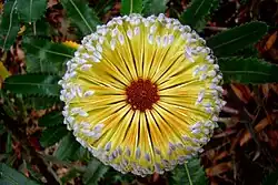 The flowers are arranged in flower spikes or capitate flower heads.[4] The character most commonly associated with Banksia is the flower spike, an elongated inflorescence consisting of a woody axis covered in tightly packed pairs of flowers attached at right angles. A single flower spike generally contains hundreds or even thousands of flowers; the most recorded is around 6000 on inflorescences of B. grandis. Not all Banksia have an elongate flower spike, however: the members of the small Isostylis complex have long been recognised as banksias in which the flower spike has been reduced to a head; and recently the large genus Dryandra has been found to have arisen from within the ranks of Banksia, and sunk into it as B. ser. Dryandra. They similarly have capitate flower heads rather than spikes.