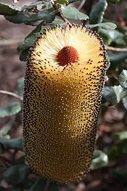 Banksia is a genus of around 170 species of flowering plants in the family Proteaceae.[1] These Australian wildflowers and popular garden plants are easily recognised by their characteristic flower spikes, and woody fruiting "cones" and heads.[2]: 1  Banksias range in size from prostrate woody shrubs to trees up to 30 metres (100 ft) tall. They are found in a wide variety of landscapes: sclerophyll forest, (occasionally) rainforest, shrubland, and some more arid landscapes, though not in Australia's deserts.