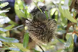 There are many fossils of Banksia. The oldest of these are fossil pollen between 65 and 59 million years old. There are fossil leaves between 59 and 56 million years old found in southern New South Wales.[20] The oldest fossil cones are between 47.8 and 41.2 million years old, found in Western Australia.[21] Although Banksia is now only native to Australia and New Guinea, there are fossils from New Zealand, between 21 and 25 million years old.[22]