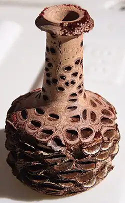 Banksia wood is reddish in color with an attractive grain but it is rarely used as it warps badly on drying. It is occasionally used for ornamental purposes in wood turning and cabinet paneling. It has also been used to make keels for small boats. Historically, the wood of certain species such as B. serrata was used for yokes and boat parts.[38] The large "cones" or seed pods of B. grandis are used for woodturning projects. They are also sliced up and sold as drink coasters; these are generally marketed as souvenirs for international tourists. Woodturners throughout the world value Banksia pods for making ornamental objects.