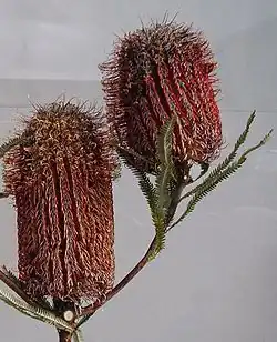 Flower spikes are held erect and are typically terminal on a branch; often other branchlets grow up and around a spike from below. The fruiting structure is a stout woody "cone", around five centimetres (2 inches) in diameter, with a hairy appearance caused by the persistence of old withered flower parts. A "cone" may be embedded with up to 60 follicles,[4] although usually there are very few or even none at all.[6] Unusually for Banksia, each follicle contains just one seed.[7] This is shiny black, oval in shape, about 20 millimetres (3⁄4 in) long, with a brown papery wing.[4][5]