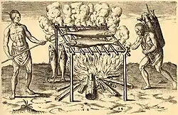 The original Arawak term barabicu was used to refer to a wooden framework. Among the framework's uses was the suspension of meat over a flame