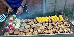 It is expected that people attending a braai bring snacks, drinks, and other meat to eat until the main meal has finished cooking on the grill. This potluck-like activity is known as "bring and braai".[28] Cooking on the braai is a bonding experience for fathers and sons, while women prepare salads and other side dishes in kitchens or other areas away from the grill.[29] Examples of meat prepared for a braai are lamb, steaks, spare ribs, sausages, chicken, and fish.[25] Mielie pap, also known as "Krummel pap", is a crumbled cornmeal that is often served as a side dish.[30][25]