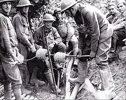 More significantly, barbed wire was used extensively by all participating combatants in World War I to prevent movement, with deadly consequences. Barbed wire entanglements were placed in front of trenches to prevent direct charges on men below, increasingly leading to greater use of more advanced weapons such as high-powered machine guns and grenades. A feature of these entanglements was that the barbs were much closer together, often forming a continuous sequence.[34] Barbed wire could be exposed to heavy bombardments because it could be easily replaced, and its structure included so much open space that machine guns rarely destroyed enough of it to defeat its purpose. However, barbed wire was defeated by the tank in 1916, as shown by the Allied breakthrough at Amiens through German lines on August 8, 1918.[35]
