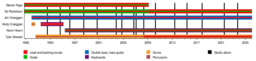 Initially a duo of singer-guitarists Ed Robertson and Steven Page,[3] the band grew to a quintet by 1990, adding brothers Jim and Andy Creeggan on bass and keyboards/congas, respectively, and drummer Tyler Stewart. Andy Creeggan left the band in 1995, and was replaced by multi-instrumentalist Kevin Hearn. Page left in 2009, reducing the group to a quartet.