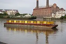 In Great Britain, a merchant barge was originally a flat bottomed merchant vessel for use on navigable rivers.[4] Most of these barges had sails. For traffic on the River Severn, the barge was described thus: "The lesser sort are called barges and frigates, being from forty to sixty feet in length, having a single mast and square sail, and carrying from twenty to forty tons burthen." The larger vessels were called trows.[5] On the River Irwell, there was reference to barges passing below Barton Aqueduct with their mast and sails standing.[6] Early barges on the Thames were called west country barges.[4]