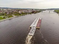 The Transportation Institute at Texas A&M found that inland barge transportation in the US produces far fewer emissions of carbon dioxide for each ton of cargo moved compared to transport by truck or rail.[23] According to the study, transporting cargo by barge produces 43% less greenhouse gas emissions than rail and more than 800% less than trucks. Environmentalists claim that in areas where barges, tugboats and towboats idle may produce more emissions like in the locks and dams of the Mississippi River.[24]