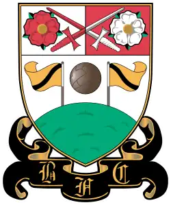The club's current crest was designed in the 1950s and contains the green hill of High Barnet and the red rose, white rose and crossed swords representing the 1471 Battle of Barnet, a pivotal battle in the Wars of the Roses. The badge was designed by Sidney Robert Price who was the chairman of the club at the time.