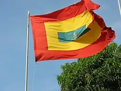 In 1811, the patriots who obtained the independence of the Cartagenas adopted the current flag. It consists of three rectangles, red being the outermost, then yellow, and green in the center. Red symbolizes the blood of patriots; yellow, the sun of freedom and hope; and green, a proud home. In the centre, there is an eight-pointed silver star, which symbolizes the eight provinces of the confederacy. The flag was carried by Simon Bolívar during the campaign of Lower Magdalena in 1811. In 1814, the Congress of Tunja adopted it as the emblem of the United Provinces of New Granada. In 1910, the Council approved the flag for Barranquilla.[19][20]
