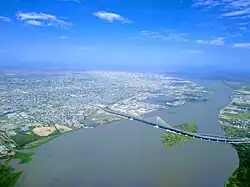 Barranquilla (/ˌbærəŋˈkiː(j)ə/; Latin American Spanish: [baraŋˈkiʝa] ⓘ) is the capital district of the Atlántico department in Colombia. It is located near the Caribbean Sea and is the largest city and third port[5] in the Caribbean coast region; as of 2018, it had a population of 1,206,319,[6][2] making it Colombia's fourth-most populous city after Bogotá, Medellín, and Cali.