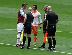 On 21 January 2014, Ferguson was installed as Blackpool's caretaker manager in the wake of Ince's sacking.[70] "I didn't want to take it, but nobody else would take the job," Ferguson explained in 2020. "And it was a chance to keep the club up."[69] He initially stated that he would not be playing while in the managerial role,[71] but on 12 April, at Leeds, he named himself in the starting line-up in an attempt to stave off the threat of relegation. "Bob [Malcolm] says to me, 'You'll need to come back in.' I said, 'Bob, I've not trained for six weeks.' He said, 'You'll need to come back and play; we're struggling.'"[72]