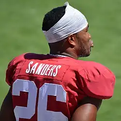 Sanders did not become the starting running back until the fourth game of his senior year, when the original player was suspended for disciplinary reasons; he rushed for 274 yards and four touchdowns in that game.[19][20] He rushed for 1,417 yards on 139 rushing attempts, averaging 10.2 yards per rushing attempt, and scored 17 touchdowns through his seven-game senior season.[12][21] In the last game of the season, Wichita North's head coach, Dale Burkholder, offered Sanders more playing time in order to gain enough rushing yards to reach the state rushing title, but Sanders declined, saying it was "not important."[22] For his season, Sanders earned all-state honors, and was named an Honorable Mention All-American.[21][23] Although he was viewed as a stellar athlete, because of his short stature Sanders received scholarship offers from only Wichita State University, Iowa State University, University of Tulsa, and Oklahoma State University; he accepted the offer from Oklahoma State.[24]