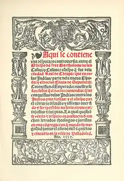 A Short Account of the Destruction of the Indies[c] (Spanish: Brevísima relación de la destrucción de las Indias) is an account written in 1542 (published in Seville in 1552) about the mistreatment of the indigenous peoples of the Americas in colonial times and sent to then-Prince Philip II of Spain. One of the stated purposes for writing the account was Las Casas's fear of Spain coming under divine punishment and his concern for the souls of the native peoples. The account was one of the first attempts by a Spanish writer of the colonial era to depict the unfair treatment that the indigenous people endured during the early stages of the Spanish conquest of the Greater Antilles, particularly the island of Hispaniola. Las Casas's point of view can be described as being heavily against some of the Spanish methods of colonization, which, as he described them, inflicted great losses on the indigenous occupants of the islands. In addition, his critique towards the colonizers served to bring awareness to his audience on the true meaning of Christianity, to dismantle any misconceptions on evangelization.[92] His account was largely responsible for the adoption of the New Laws of 1542, which abolished native slavery for the first time in European colonial history and led to the Valladolid debate.[93]