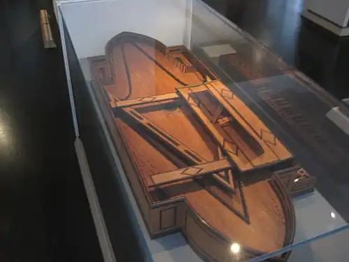An apparent remnant harpsichord, lacking soundboard, keyboard, and action, is currently the property of the noted builder Tony Chinnery, who acquired it at an auction in New York. This instrument passed through the shop of the late 19th century builder/fraudster Leopoldo Franciolini, who reworked it with his characteristic form of decoration, but according to Chinnery "there are enough construction details to identify it definitely as the work of Cristofori".[19]
