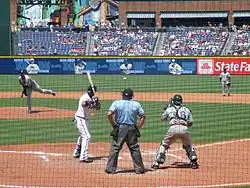 Mark Hendrickson of the Florida Marlins intentionally walking the Atlanta Braves' Yunel Escobar in 2008. Note the Florida catcher, Mike Rabelo, in a standing position behind the opposite batter's box to receive the pitch. This method of issuing an intentional walk is no longer used in Major League Baseball.