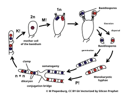 Smuts with both a yeast phase and an infectious hyphal state are examples of dimorphic Basidiomycota.[18] In plant parasitic taxa, the saprotrophic phase is normally the yeast while the infectious stage is hyphal. However, there are examples of animal and human parasites where the species are dimorphic but it is the yeast-like state that is infectious.[19] The genus Filobasidiella forms basidia on hyphae but the main infectious stage is more commonly known by the anamorphic yeast name Cryptococcus, e.g. Cryptococcus neoformans[20] and Cryptococcus gattii.[19]