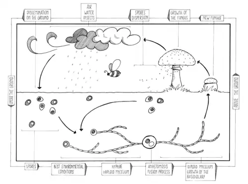 Scheme of a typical basidiocarp, the dipoid reproductive structure of a basidiomycete, showing fruiting body, hymenium and basidia.