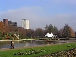 Basingstoke suffered very little bomb damage during the Second World War. A stick of German bombs did fall in the Church Square area on 16 August 1940. On the same day, bombs destroyed part of a row of houses in Burgess Road; six people were killed in the raid.[28] Overall, 13 civilians died from enemy action during the war in the town.[29] After the war, the town had a population of 25,000.[30]