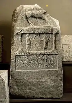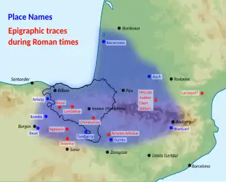 Latin inscriptions in Gallia Aquitania preserve a number of words with cognates in the reconstructed proto-Basque language, for instance, the personal names Nescato and Cison (neskato and gizon mean 'young girl' and 'man', respectively in modern Basque). This language is generally referred to as Aquitanian and is assumed to have been spoken in the area before the Roman Republic's conquests in the western Pyrenees. Some authors even argue for late Basquisation, that the language moved westward during Late Antiquity after the fall of the Western Roman Empire into the northern part of Hispania into what is now the Basque Country.[15]