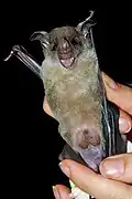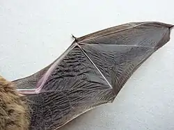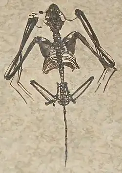 The delicate skeletons of bats do not fossilise well; it is estimated that only 12% of bat genera that lived have been found in the fossil record.[7] The oldest known bat fossils include Archaeonycteris praecursor and Altaynycteris aurora (55–56 million years ago), both known only from isolated teeth.[8][9] The oldest complete bat skeletons are Icaronycteris gunnelli and Onychonycteris finneyi (52 million years ago), known from two skeletons discovered in Wyoming.[1][10] The extinct bats Palaeochiropteryx tupaiodon and Hassianycteris kumari, both of which lived 48 million years ago, are the first fossil mammals whose colouration has been discovered: both were reddish-brown.[11]