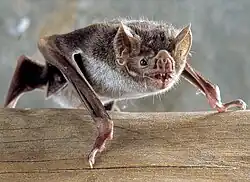 A dialectal English name for bats is "flittermouse", which matches their name in other Germanic languages (for example, German Fledermaus and Swedish fladdermus), related to the fluttering of wings. Middle English had bakke, most likely cognate with Old Swedish natbakka ('night-bat'), which may have undergone a shift from -k- to -t- (to Modern English bat) influenced by Latin blatta, 'moth, nocturnal insect'. The word bat was probably first used in the early 1570s.[2][3] The order name Chiroptera derives from the Ancient Greek χείρ (kheír), meaning "hand",[4] and πτερόν (pterón), meaning "wing".[5][6]