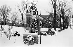 The college, under the direction of Cheney, rejected fraternities and sororities on grounds of unwarranted exclusivity.[22] He asked his close friend and U.S. Senator Charles Sumner to create a collegiate motto for Bates and he suggested the Latin phrase amore ac studio which he translated as "with love for learning" which has been taken as "with ardor and devotion,"[24] or "through zeal and study."[25] Prior to the start of the American Civil War, Bates graduated Brevet Major Holman Melcher, who served in the Union Army in the 20th Maine Volunteer Infantry Regiment. He was the first person to charge down Little Round Top at the Battle of Gettysburg.[26] The college graduated the last surviving Union general of the American Civil War, Aaron Daggett. The college's first African-American student, Henry Chandler, graduated in 1874.[27] James Porter, one of General Custer's eleven officers killed at the Battle of Little Bighorn in 1876 was also a Bates graduate. In 1884, the college graduated the first woman to argue in front of the U.S. Supreme Court, Ella Haskell.[28]