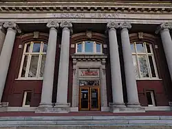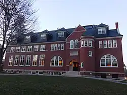 While attending and leading the Freewill Baptist Parsonsfield Seminary, Bates founder, Oren Burbank Cheney worked on various racial and gender equality, religious freedom, and temperance issues.[13] In 1836, Cheney enrolled in Dartmouth College, due to the school's significant support of the abolitionist cause against slavery.[13] After graduating, Cheney was ordained a Baptist minister and began to establish himself as an educational and religious scholar.[13] Parsonsfield mysteriously burned down in 1854, allegedly due to arson by opponents of abolition.[14][13] The event caused Cheney to advocate for a new seminary in a more central part of Maine.[13] With Cheney's influence in the state legislature, the Maine State Seminary was chartered in 1855 and implemented a liberal arts and theological curriculum, making the first coeducational college in New England.[15][16] Soon after establishment several donors stepped forward to finance portions of the school, such as Seth Hathorn, who donated the first library and academic building, which was renamed Hathorn Hall.[13] The Cobb Divinity School became affiliated with the college in 1866. Four years later in 1870, Bates sponsored a college preparatory school, called the Nichols Latin School.[13] The college was affected by the financial panic of the later 1850s and required additional funding to remain operational.[13] Cheney's impact in Maine was noted by Boston business magnate Benjamin Bates who developed an interest in the college. Bates gave $100,000 in personal donations and overall contributions valued at $250,000 to the college.[17] The school was renamed Bates College in his honor in 1863 and was chartered to offer a liberal arts curriculum beyond its original theological focus.[18] Two years later the college would graduate the first woman to receive a college degree in New England, Mary Mitchell.[19] The college began instruction with a six-person faculty tasked with the teaching of moral philosophy and the classics. From its inception, Bates College served as an alternative to a more traditional and historically conservative Bowdoin College.[20][21] There is a complex relationship between the two colleges, revolving around socioeconomic class, academic quality, and collegiate athletics.[22][23]
