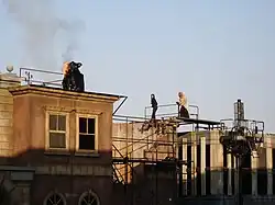 Mentmore Towers was chosen from twenty different locations for Wayne Manor, as Nolan and Crowley liked its white floors, which gave the impression of the manor as a memorial to Wayne's parents.[57] The building chosen to represent Arkham Asylum was the National Institute for Medical Research building in Mill Hill, northwest London, England.[58] The St Pancras railway station and the Abbey Mills Pumping Stations were used for Arkham's interiors.[55] The Senate House of University College London was used for courtrooms.[55] Some scenes, including the Tumbler pursuit,[21] were filmed in Chicago at locations such as Lower Wacker Drive and 35 East Wacker.[59] Authorities agreed to raise Franklin Street Bridge for a scene where access to the Narrows is closed.[21]