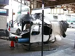 The styrofoam model was used to create a steel "test frame", which had to stand up to several standards: have a speed of over 100 miles per hour (160 km/h), go from 0 to 60 miles per hour (97 km/h) in 5 seconds, possess a steering system to make sharp turns at city corners, and withstand a self-propelled launch of up to 30 feet (9.1 m). On the first jump test, the Tumbler's front end collapsed and had to be completely rebuilt. The basic configuration of the newly designed Tumbler included a 5.7-liter Chevy V8 engine, a truck axle for the rear axle, front tires by Hoosier (which are actually dirt racing tires used on the right rear of open wheel sprint cars), 4 rear 44/18.5-16.5 Interco Super Swamper TSL tires (44" tall, 18.5" wide, mounted on a 16.5" wheel) and the suspension system of Baja racing trucks. The design and development process took nine months and cost several million dollars.[65]