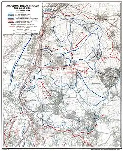 Aachen and its sector of the front were protected by the Siegfried Line, consisting of several belts of inter-connected pillboxes, forts, and bunkers protected by extensive minefields, "dragon's teeth" anti-tank obstacles, and barbed wire entanglements.[29] In several areas, German defenses were over 10 mi (16 km) deep.[30] Learning from their experiences on the Eastern Front, the Germans ran their main line of resistance down the center of towns located in the defensive wall, taking advantage of narrow streets to limit the mobility of enemy armored vehicles.[31] Despite the low quality of many of the troops manning them, the fortifications protecting Aachen and the Ruhr were a formidable obstacle to the progress of American forces,[32] who saw a breakthrough in this sector as crucial, as the terrain behind Aachen was generally flat, and therefore highly favorable to the motorized Allied armies.[33]