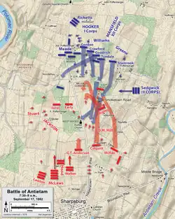 The battle opened at dawn (about 5:30 a.m.) on September 17 with an attack down the Hagerstown Turnpike by the Union I Corps under Joseph Hooker. Hooker's objective was the plateau on which sat the Dunker Church, a modest whitewashed building belonging to a congregation of German Baptist Brethren. Hooker had approximately 8,600 men, little more than the 7,700 defenders under Stonewall Jackson, and this slight disparity was more than offset by the Confederates' strong defensive positions.[53] Abner Doubleday's division moved on Hooker's right, James Ricketts's moved on the left into the East Woods, and George Meade's Pennsylvania Reserves division deployed in the center and slightly to the rear. Jackson's defense consisted of the divisions under Alexander Lawton and John R. Jones in line from the West Woods, across the Turnpike, and along the southern end of Miller's Cornfield. Four brigades were held in reserve inside the West Woods.[54]