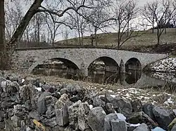 Burnside had four divisions (12,500 troops) and 50 guns east of Antietam Creek. Facing him was a force that had been greatly depleted by Lee's movement of units to bolster the Confederate left flank. At dawn, the divisions of Brig. Gens. David R. Jones and John G. Walker stood in defense, but by 10 a.m. all of Walker's men and Colonel George T. Anderson's Georgia brigade had been removed. Jones had only about 3,000 men and 12 guns available to meet Burnside. Four thin brigades guarded the ridges near Sharpsburg, primarily a low plateau known as Cemetery Hill. The remaining 400 men—the 2nd and 20th Georgia regiments, under the command of Brigadier General Robert Toombs, with two artillery batteries—defended Rohrbach's Bridge, a three-span, 125-foot (38 m) stone structure that was the southernmost crossing of the Antietam.[100] It would become known to history as Burnside's Bridge because of the notoriety of the coming battle. The bridge was a difficult objective.[101] The main road leading to it was exposed to enemy fire, but a farm lane allowed a more protected approach to around 250 yards (230 m) from the bridge.[102] The bridge was dominated by a steep bluff on the west bank, and trees and an old quarry provided cover for defenders.[103] The Confederates also strengthed their position with breastworks made from logs and fence rails.[101]
