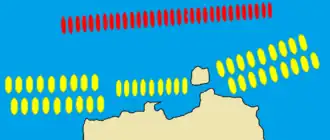 At dawn the next day, Callicratidas led his fleet out to meet the Athenians. He had 140 ships to match the Athenians' 150 and had left 50 to watch Conon at Mytilene. For the first time in the war, the Spartan crews and commanders were more experienced than their Athenian opposites, as the Athenians' best crews had been at sea with Conon.[6] To counter the Spartans' superior skill and maneuverability, the Athenian commanders implemented several new and innovative tactics. Firstly, the Athenian fleet was divided into eight autonomous divisions, each commanded by one of the generals. Secondly, they arranged their fleet in a double line, instead of the traditional single line, to prevent the Spartans from using the maneuver known as the diekplous in which a trireme raced into a gap between two enemy ships and then wheeled to strike one of them in the side. If the Spartans attempted that against a double line, a ship from the second line could move up to attack the Spartan ship.[7]