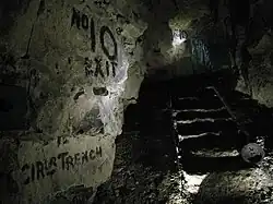 On the First Army front German sappers also conducted underground operations, seeking out Allied tunnels to assault and counter-mine, in which 41 New Zealand tunnellers were killed and 151 wounded.[36] The British tunnellers had gained an advantage over the German miners by the Autumn of 1916, which virtually ended the German underground threat. The British turned to digging 12 subways about 25 ft (7.6 m) down, to the front line, the longest tunnel being 1,883 yd (1.070 mi; 1.722 km) long of the 10,500 yd (6.0 mi; 9.6 km) dug. In one sector, four Tunnelling companies of 500 men each, worked around-the-clock in 18-hour shifts for two months to dig 12 mi (20 km) of subways for foot traffic, tramways with rails for hand-drawn trolleys and a light railway system.[36] Most tunnels were lit by electricity, accommodated telephone cables and some had trams and water supplies. Caverns were dug into the sides for brigade and battalion HQs, first aid posts and store-rooms. The subways were found to be a most efficient way to relieve troops in the line, form up for the attack and then to evacuate wounded. Some of the tunnels were continued into Russian saps with exits in mine craters in no man's land and new mines were laid. Galleries were dug to be opened after the attack for communication or cable trenches, the work being done by the 172nd, 176th, 182nd and 185th Tunnelling companies (Lieutenant-Colonel G. C. Williams, Controller of Mines First Army).[37][b]
