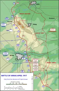 With a view to economising my troops, my objectives were shallow and for a like reason and also in order to give the appearance of an attack on a more imposing scale, demonstrations were continued southwards to the Arras–Cambrai Road and northwards to the Souchez River.[61]