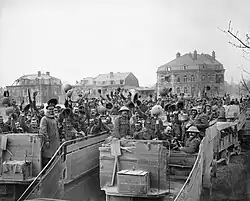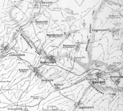 The Cojeul river marked a divisional boundary within VI Corps. Guémappe on the north side of the river was the objective of the 15th (Scottish) Division, attacking east from Wancourt towards Vis-en-Artois.[59] The objective was commanded by the higher ground on the south bank and it was not until the 50th (Northumbrian) Division captured the rise on the south side of the Cojeul that the village was taken. Several determined German counter-attacks were made and by the morning of 24 April, the British held Guémappe, Gavrelle and the high ground overlooking Fontaine-lès-Croisilles and Cherisy; the fighting around Roeux was indecisive.[60]
