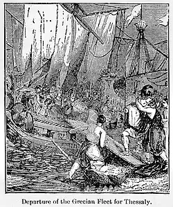 Around ten days later, the Persian army arrived at Thermopylae, and the Allies at Chalcis were informed by a ship, captained by Abronichus, which had been appointed to liaise between the army and the fleet.[13] However, there was still no sign of the Persian fleet, and the first day the Persians spent at Thermopylae passed without them launching an attack.[19] The next day, the Persian fleet finally drew near to Artemisium, heading for the Gap of Skiathos located between the coast of Magnesia and Skiathos, when a summer gale (a 'Hellesponter' – probably a north-easterly storm)[20] broke, driving the Persian fleet onto the mountainous coast.[19][21] The storm lasted two days, wrecking approximately one third of the Persian ships.[19][22] Meanwhile, at Thermopylae, the Persians had continued to wait for the Greeks to disperse, also choosing not to attack during the storm.[19]