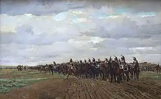 The Russians had a numerical advantage; however, the tide soon swung as Drouet's Division, the 2nd of Bernadotte's I Corps, deployed on the flank of the action and allowed French cavalry to seek refuge behind their lines. The horse artillery of the Guard also inflicted heavy casualties on the Russian cavalry and fusiliers. The Russians broke, and many died as they were pursued by the reinvigorated French cavalry for about a quarter of a mile.[90] Kutuzov was severely wounded, and his son-in-law, Ferdinand von Tiesenhausen, was killed.[66]