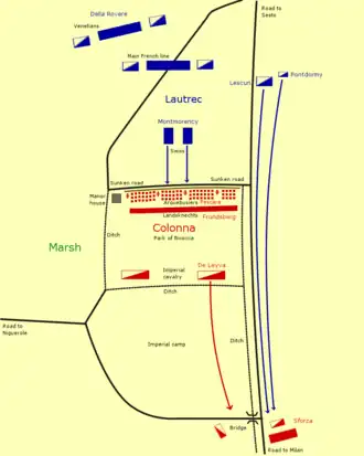 Lescun, with about 400 heavy cavalry under his command, had meanwhile reached the bridge south of the park and fought his way across it and into the Imperial camp beyond.[46] Colonna responded by detaching some cavalry under Antonio de Leyva to halt the French advance, while Sforza came up the road towards the bridge, aiming to surround Lescun.[47] Pontdormy held off the Milanese, allowing Lescun to extricate himself from the camp; the French cavalry then retraced its path and rejoined the main body of the army.[48]