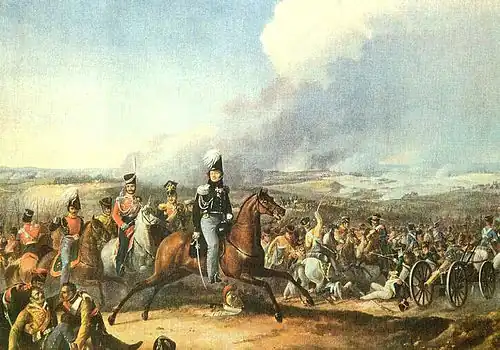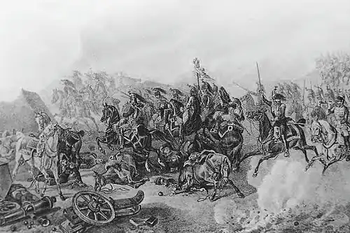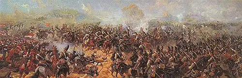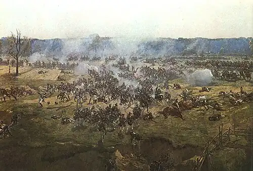 General Thielmann then led eight Saxon and two Polish cavalry squadrons against the back of the redoubt, while officers and sergeants of his command actually forced their horses through the redoubt's embrasures, sowing confusion amongst the defenders and allowing the French cavalry and infantry to take the position. The battle had all but ended, with both sides so exhausted that only the artillery was still at work.[24] At 15:30, the Raevsky redoubt fell with most of the 24th Division's troops. General Likhachov was captured by the French.[60] However, the French attempts to break through further were thwarted by the Russian Guard Cavalry, which charged and repelled the French assault.