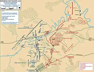 The initial Russian position, which stretched south of the new Smolensk Highway (Napoleon's expected route of advance), was anchored on its left by a pentagonal earthwork redoubt erected on a mound near the village of Shevardino.[35] The Russian generals soon realized that their left wing was overly exposed and vulnerable,[36] so the Russian line was moved back from this position, but the Redoubt remained manned, Kutuzov stating that the fortification was manned simply to delay the advance of the French forces. Historian Dmitry Buturlin reports that it was used as an observation point to determine the course of the French advance. Historians Witner and Ratch, and many others, reported it was used as a fortification to threaten the French right flank, despite being beyond the effective reach of guns of the period.[35]