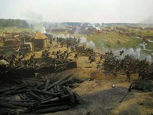 Russian forces present at the battle included 180 infantry battalions, 164 cavalry squadrons, 20 Cossack regiments and 55 artillery batteries (637 artillery pieces). In total, the Russians fielded 155,200 troops.[3] There were 10,000 Cossacks as well as 33,000 Russian militiamen in the area who did not participate in the battle; thus, a total of 43,000 irregulars. After the battle the militia units were broken up to provide reinforcements to depleted regular infantry battalions. Of the 637 Russian artillery pieces, 300 were held in reserve and many of these were never committed to the battle.[5]
