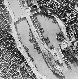 ![]() A German Luftwaffe Heinkel He 111 bomber flying over Wapping and the Isle of Dogs in the East End of London at the start of the Luftwaffe's evening raids of 7 September 1940. | |||||||
